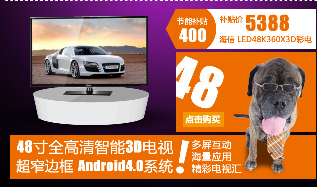- 海信(Hisense)LED40K360X3D彩电购买后再享受国家节能补贴300元!39英寸智能3D电视!超窄边框,Android4.0系统,多屏互动,海量应用,精彩电视汇。