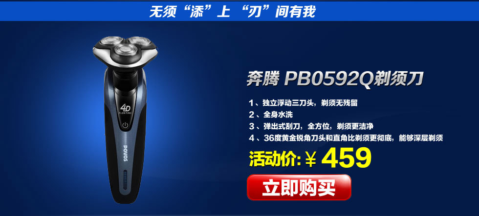 - 奔腾(POVOS)PQ8606剃须刀厨卫生活“爱上家”主题活动7月3日至8月5日,全场订单满499减50、满999减100、满1999减200、满2999减300、满3999减400,加入购物车可见!
