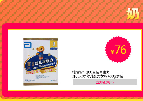 雅培金装儿童喜康力儿童配方奶粉(智护)400g【7月25日-28日百货全场送现金】,母婴品类订单金额满100送30现金券,满300送100现金券,连续四天倾情让利!